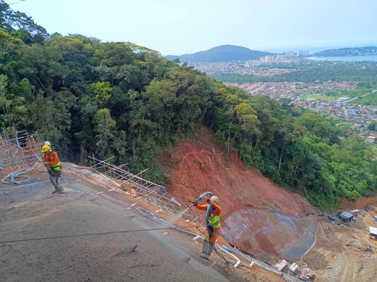 A contenção de concreto utiliza a técnica de solo grampeado, assim como nas demais encostas. A diferença é a forma de acesso. Uma equipe especializada em rapel leva todo o material utilizando métodos seguros que vençam as dificuldades da verticalidade do talude. Só assim é possível levar concreto, mangueiras injetoras de concreto e os próprios profissionais responsáveis pelos serviços. Tudo é executado conforme as normas de segurança.